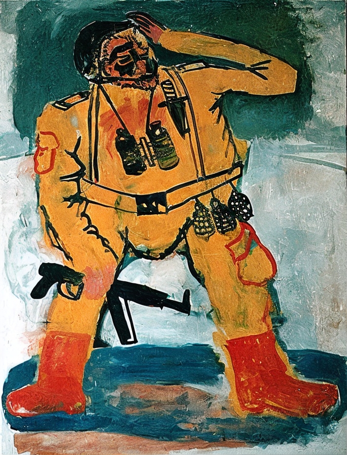 Однажды ночью в своей мастерской на Корнелис Дреббелстраат я написал эту фигуру за несколько минут — Украинский Десантник, приблизительно 200×150 см, холст.